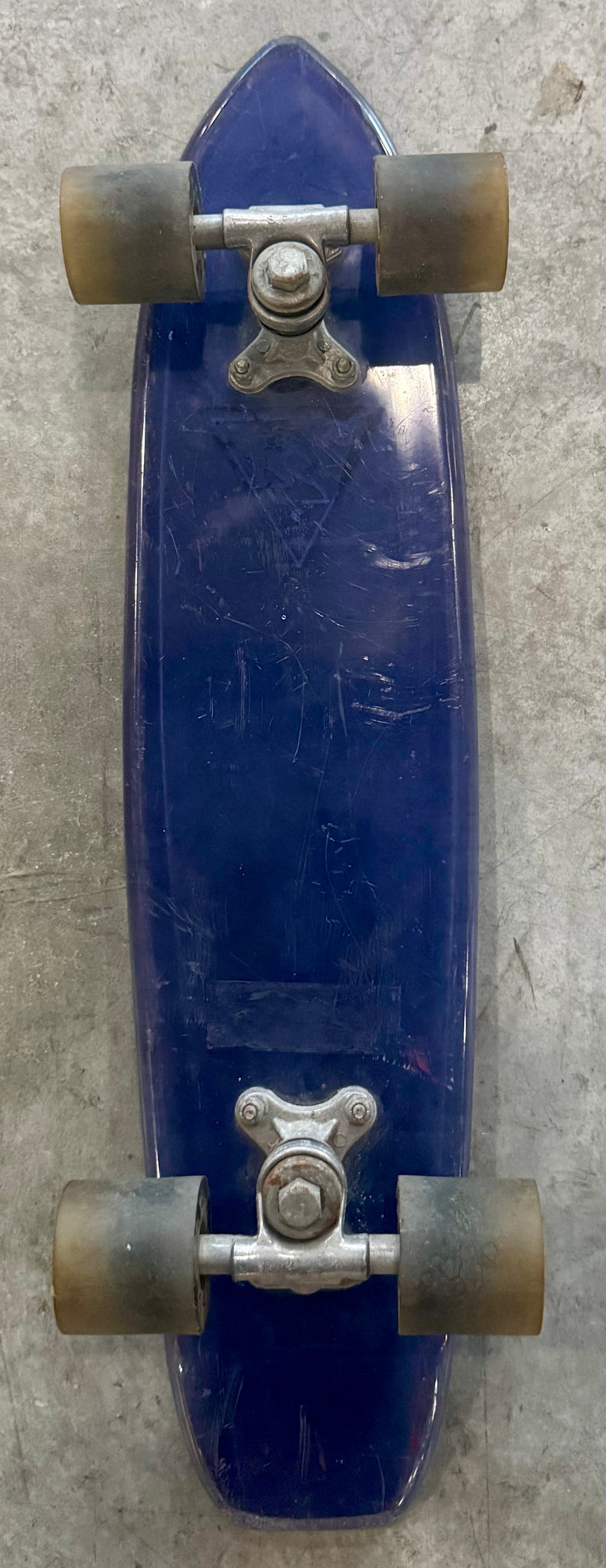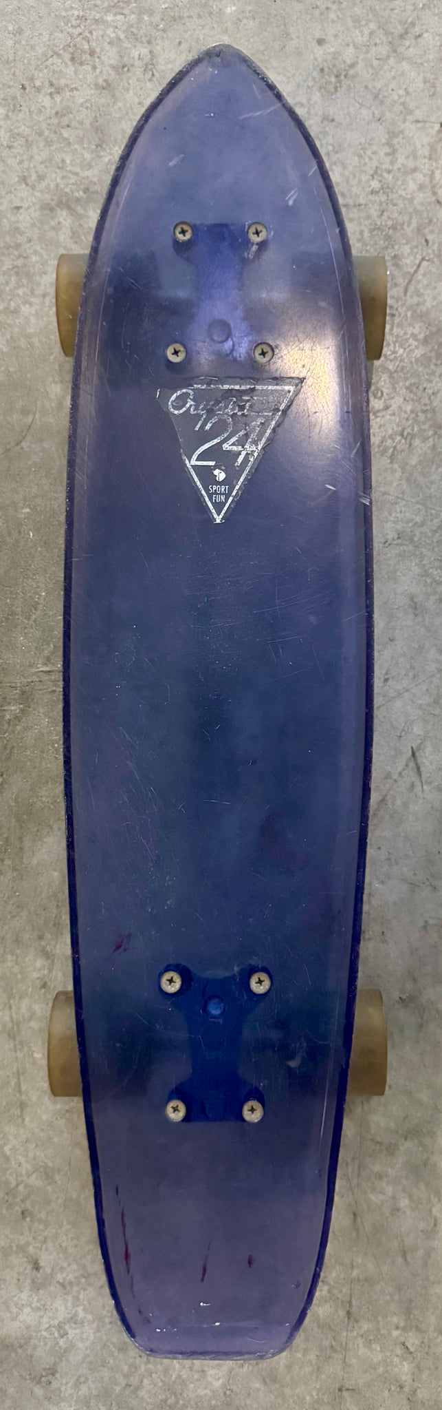 Vintage 1970’s Clear Plastic Skateboard made by Sport Fun. The Crystal 24 is an all original, clear blue 70’s Skateboard in good original condition. All 4 wheels roll as they should. What you see is what you get.